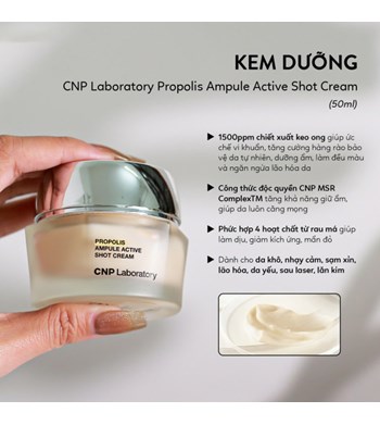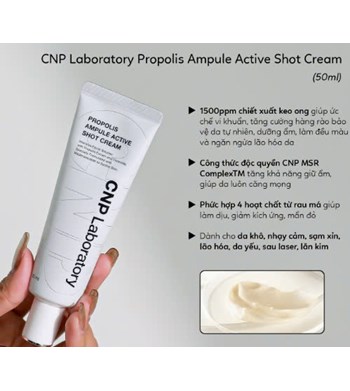 – CNP Laboratory Propolis Ampule Active Shot Cream giúp dưỡng ẩm sâu cho làn da thiếu sức sống với phức hợp CNP MSR ComplexTM độc quyền gồm keo ong, chiết xuất lựu, chiết xuất trái sung, Beta -Glucan,… tăng khả năng giữ ẩm lên 166%.