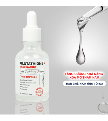 Angel’s Liquid Glutathione + Niacinamide 700V-ampoule cải thiện chuyên sâu tình trạng da sạm màu, thâm nám, tàn nhang, se khít lỗ chân lông và làm mờ nếp nhăn li ti. Hơn hết, sản phảm này đã tạo tiếng vang lớn trong giới skincare vì bảng thành phần đạt điểm 10 về chất lượng.