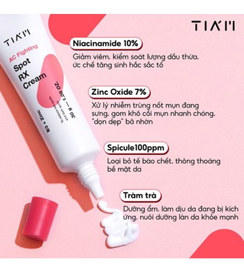 - Kem Chấm Mụn Hỗ Trợ Xẹp Mụn Ngừa Thâm Sẹo Tiam AC Fighting Spot RX Cream được bào chế an toàn cho thanh thiếu niên và người lớn để giúp kiểm soát mụn trứng cá và làm sạch mụn.