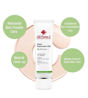 - Kem chống nắng Cell Fusion C Clear Sunscreen 100 được bổ sung hoạt chất AHA, BHA và PHA hỗ trợ trị mụn dành cho da nhạy cảm nhất. Kem chống nắng bảo vệ da mụn, ngăn chặn tác động xấu từ UV một cách hoàn hảo và an toàn. Sản phẩm đang được ưa chuộng tại Hàn Quốc và nhiều quốc gia khắp châu Á.