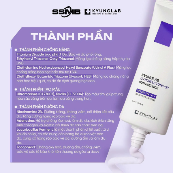 Kyunglab UV Purple Tone-Up Sun Essence 50ml là kem chống nắng kết hợp dưỡng da giúp bảo vệ da khỏi tia UV, đồng thời nâng tone tím để trung hòa sắc vàng, mang lại làn da sáng trong, đều màu và rạng rỡ hơn ngay sau khi sử dụng.
