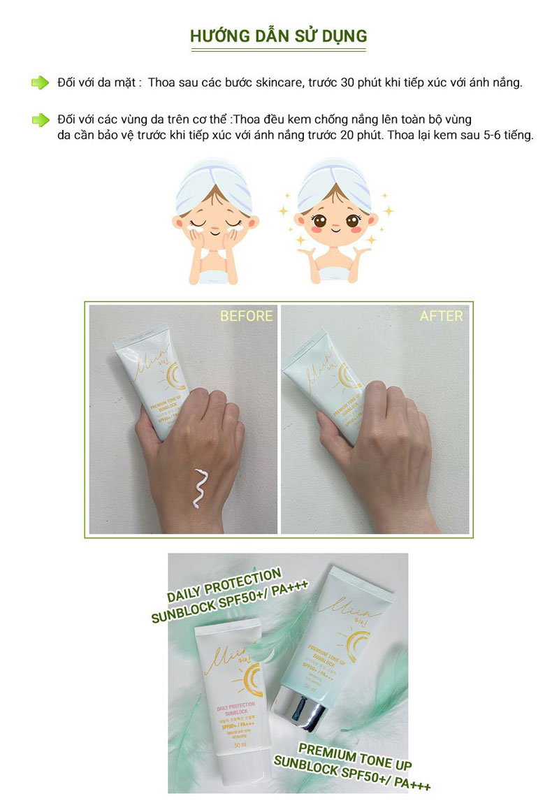 Miin Premium Tone Up Sunblock SPF50+ 50ml là sản phẩm chống nắng cho mọi loại da với chỉ số khá lý tưởng SPF50+ PA+++. Sản phẩm có khả năng chống nắng, bảo vệ da tuyệt đối dưới ánh nắng mặt trời đồng thời có khả năng nâng tone tự nhiên, rất biết cách phối với với các bước trang điểm khác. Đặc biệt, sản phẩm khiến nhiều người hài lòng với khả năng không gây bí hoặc khô da, giảm thiểu kích ứng đồng tời bổ sung độ ẩm cho da. Điều này giúp ngăn ngừa khả năng gây ra mụn và nhiều vấn đề khác trên da. Một ưu điểm nữa mà bạn sẽ cực thích ở sản phẩm đó là khả năng chống thấm nước. Nhờ đó, sản phẩm giữ được khá lâu trên da, đồng thời giữ cho lớp kem lâu trôi hơn, tăng cường hiệu quả chống nắng. Với sản phẩm, bạn có thể thoải mái hoạt động và làm việc dưới nắng mà không lo sợ những tác hại của ánh nắng, luôn tự tin và năng động trong mọi cuộc chơi.
