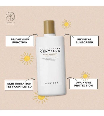 Kem Chống Nắng Skin1004 Madagascar Centella Air-fit Suncream là kem chống nắng siêu nhẹ, với chỉ số spf 50++++ giúp bảo vệ hàng ngày cùng chiết xuất rau má Centifolia Asiatica từ Madagascar, giúp làm dịu da và tạo lớp nền trang điểm nhẹ nhàng.
