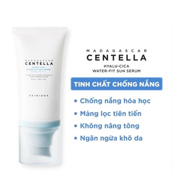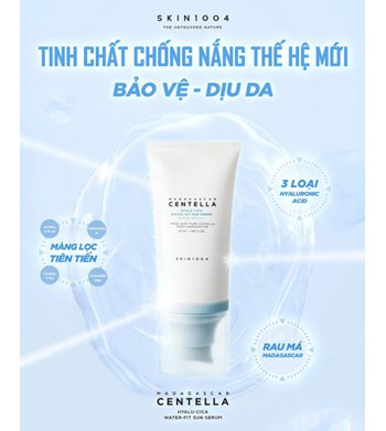 Tinh chất chống nắng Skin1004 Madagascar Centella Hyalu-Cica Water-Fit Sun Serum SPF50+ PA++++ giúp bảo vệ da trước các tác động của tia UVA, UVB, bổ sung độ ẩm tăng cường hàng rào bảo vệ da dưới ánh nắng mặt trời.