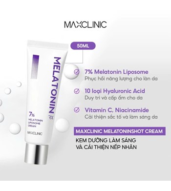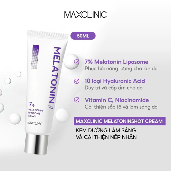 Maxclinic 7% Melatonin Liposome Cream RX 50ml là kem dưỡng cao cấp ứng dụng công nghệ Liposome hiện đại, giúp đưa hoạt chất Melatonin 7% thẩm thấu sâu vào da, hỗ trợ phục hồi tổn thương, làm sáng và cải thiện độ đàn hồi rõ rệt.