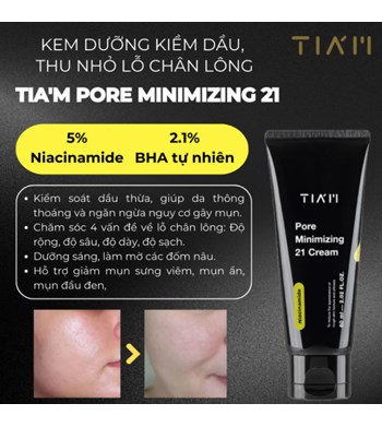 Kem Dưỡng Kiểm Soát Dầu Nhờn, Thu Nhỏ Lỗ Chân Lông Tiam Pore Minimizing 21 Cream là tinh chất dưỡng thuộc thương hiệu Tiam đến từ Hàn Quốc. Phức hợp Niaciamide + Zin PCA + HA kiểm soát lượng dầu thừa nhưng vẫn cân bằng được độ ẩm cần thiết cho da, cải thiện lỗ chân lông. Đồng thời, hỗ trợ làm mờ các đốm nâu và hỗ trợ dưỡng sáng da.