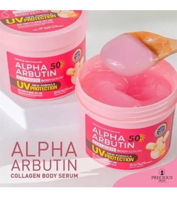 Kem dưỡng trắng chống nắng toàn thân Alpha Arbutin Collagen SPF50 New UV Cream Protection 500ml được xuất xứ tại Thái Lan và bổ sung thành phần collagen, có khả năng chống tia UV và tia cực tím bảo vệ làn da trắng hồng rạng rỡ, căng mịn và chắc khỏe dưới ánh nắng mặt trời.