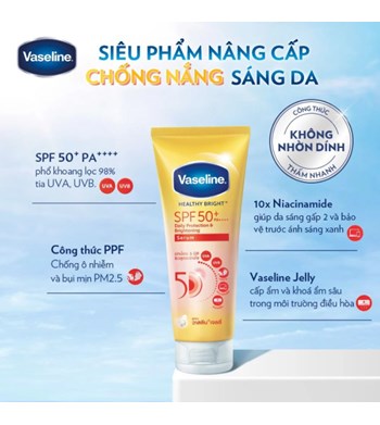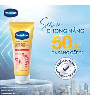 Sữa dưỡng thể Vaseline Healthy Bright SPF50+ Daily Protection & Brightening Serum dưỡng da chống nắng 300ml là sản phẩm dưỡng da chống nắng cao cấp của thương hiệu Vaseline. Sản phẩm được thiết kế để bảo vệ toàn diện cho da khỏi tác hại của tia UVB và UVA, đồng thời cung cấp dưỡng chất để giữ cho làn da luôn khỏe mạnh và tươi trẻ.
