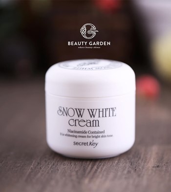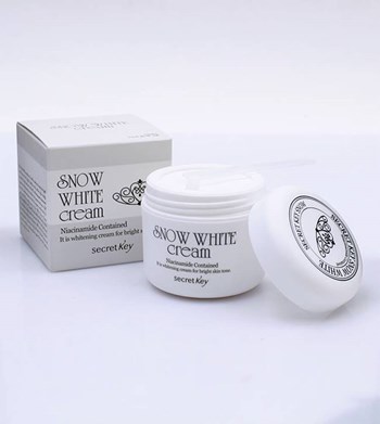 Kem dưỡng trắng da Snow White Cream có xuất xứ từ thương hiệu mỹ phẩm Secret Key - Hàn Quốc với dung tích 50gr là dòng kem được sử dụng công nghệ Naiacinamide (hay còn gọi là vitamin B3) dưỡng trắng da và chống lão hóa. Ngoài ra kem còn có công dụng khác như BB cream và kem lót trang điểm makeup base rất đa năng. Với nền màu trắng cùng dòng chứ đen làm nổi bật bao bì sản phẩm. Đi kèm là chiếc muỗng để bạn tiện lấy kem hơn.
