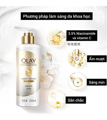 Sữa dưỡng thể trắng da Olay B3+ Body Cellscience với hai thành phần được xem là bộ đôi trong việc làm trắng sáng da Niacinamide (Vitamin B3) + vitamin C giúp dưỡng trắng da hiệu quả từ sâu bên trong, nâng tone da nhẹ nhàng, làm mờ các vết thâm đồng thời cấp ẩm và nuôi dưỡng làn da ẩm mịn, tươi sáng đầy sức sống.