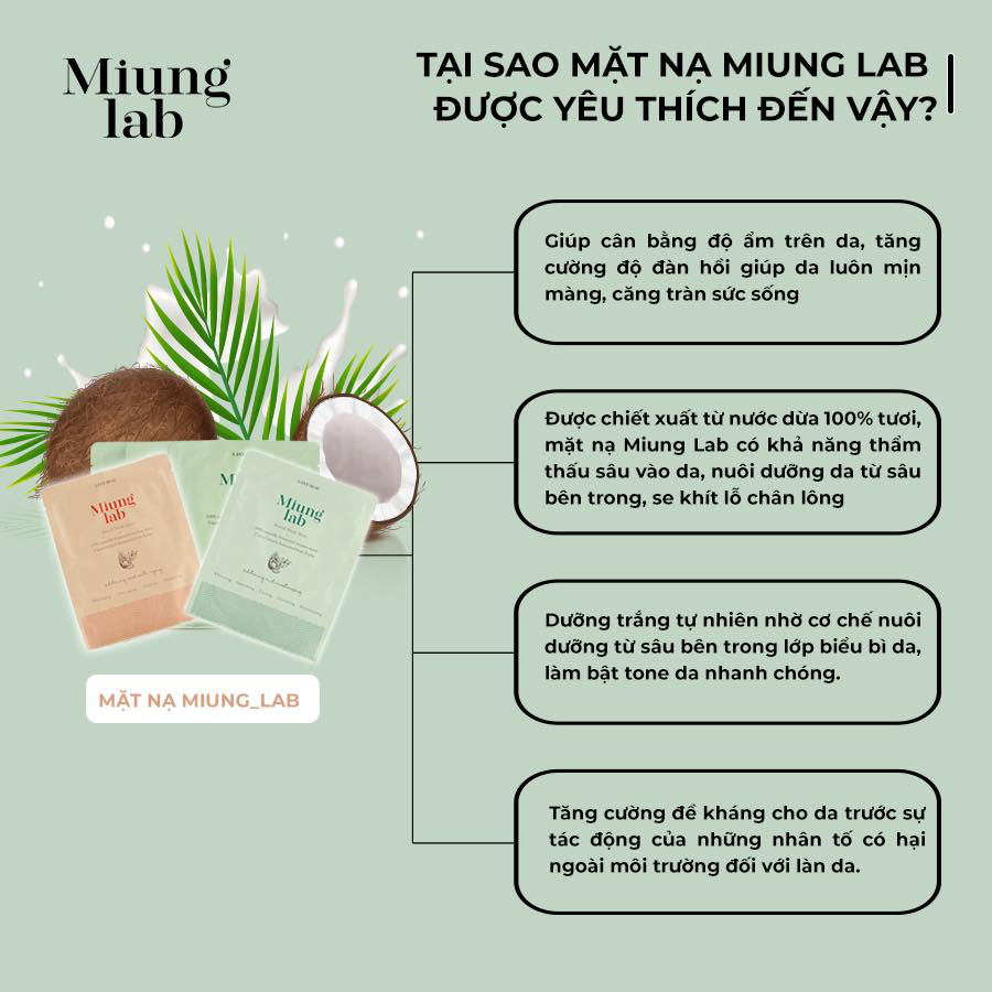 Mặt nạ #Miung_Lab được lên men từ nước dừa tươi tạo nên một lớp màng mát lạnh, mỏng nhẹ giúp bạn thư giãn, thoải mái làn da khi sử dụng. Dưỡng chất thẩm thấu nhanh vào da, giúp da căng bóng, rạng ngời ngay sau khi sử dụng.