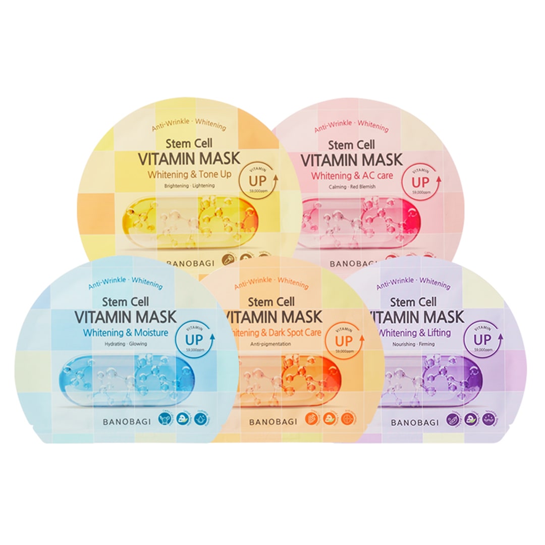 + Màu xanh dương - Banobagi Steam Cell Vitamin Mask Whitening & Moisture: Chứa phức hợp vitamin và tế bào gốc xương rồng, tạo một hàng rào cấp ẩm, giúp da sáng mịn. Dòng mask này phù hợp với da nhạy cảm, dễ kích ứng, gặp phải vấn để thiếu ẩm.