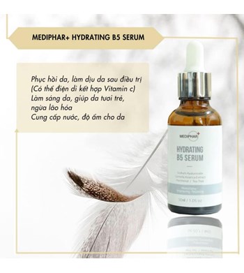 Mediphar+ Hydrating B5 Serum dưỡng ẩm phục hồi. cung cấp nước, độ ẩm cho da, làm sáng da. Cung cấp dưỡng chất cho da, giúp da khỏe, luôn căng mịn. Với khả năng làm lành các tổn thương trên da, khuyên dùng cho các liệu trình đặc trị cần thêm serum để phục hồi da.