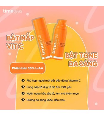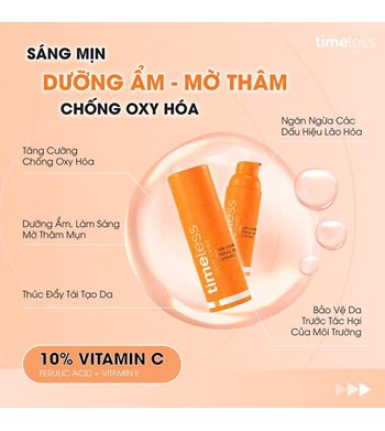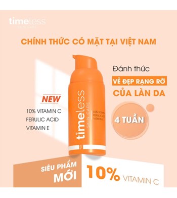 Serum Timeless 10% Vitamin C + E + F 30ml là sản phẩm dưỡng sáng hoàn hảo cho da nhạy cảm với nồng độ 10% Vitamin C dạng L-AA giúp làm sáng, làm đều màu da, chống oxy hoá, kích thích sản sinh ra collagen và ngăn ngừa các vấn đề lão hoá da. Ở nồng độ thấp này sẽ giúp da tập làm quen với Vitamin C trước khi sử dụng nồng độ cao hơn.