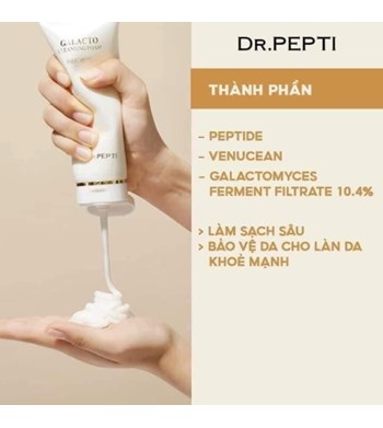 Sữa Rửa Mặt Tạo Bọt Dưỡng Trắng Da Dr.Pepti+ Galacto Cleansing Foam là sữa rửa mặt thuộc thương hiệu Dr.Pepti+ với thành phần chính chứa Copper Tripeptide-1 bảo vệ hàng rào bảo vệ da, và thành phần VENUCEANE™, thành phần lên men “ nổi tiếng” Galactomyces có khả năng loại bỏ tế bào chết nhẹ nhàng, nuôi dưỡng làn da sáng mịn.