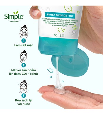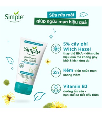 Gel rửa mặt Simple Purifying Gel Wash Deeply Cleanses For Controlled Shine And Clear Skin với công thức độc đáo, thành phần hỗn hợp từ cỏ xạ hương, kẽm và nước cây phỉ giúp làm sạch sâu bụi bẩn, dầu thừa và cặn trang điểm mà vẫn êm dịu với làn da.