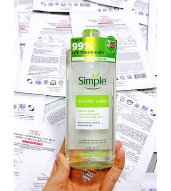- Nước tẩy trang Simple Kind to Skin Micellar Cleansing Water là dòng tẩy trang bán chạy nhất của hàng mỹ phẩm Simple kể từ khi ra mắt. Với hiệu quả làm sạch mạnh mẽ, ngay lập tức có thể lấy đa bã nhờn, bụi bẩn và lớp makeup, kể cả kem chống nắng, tẩy trang Simple Micellar Cleansing Water được rất rất nhiều tín đồ làm đẹp ưa chuộng.