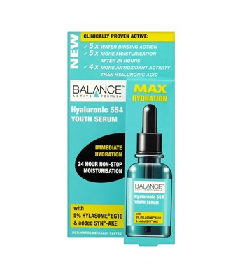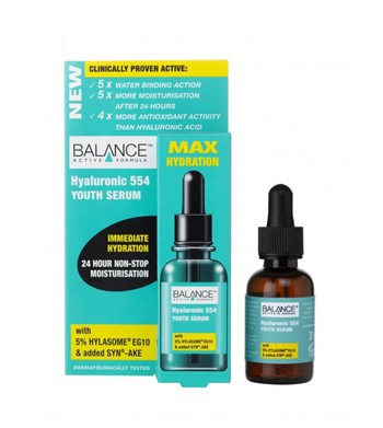 Balance lại mang đến một công thức dưỡng ẩm chuyên sâu hơn nữa nhờ 5% Hylasome EG10 – một chất được chứng minh có khả năng giữ nước gấp 5 lần HA, cấp ẩm gấp 5 lần HA, chống oxy hóa cũng gấp 4 lần so với HA và hiệu quả đó có thể kéo dài lên đến 24 giờ đồng hồ, giúp cho Balance Active Formula Hyaluronic 554 Youth Serum dưỡng ẩm thật sự “xuất sắc”, đáp ứng được nhu cầu cơ bản nhất trong quá trình chăm sóc da mỗi ngày của các cô gái: cấp ẩm, dưỡng ẩm và liên tục bổ sung độ ẩm.