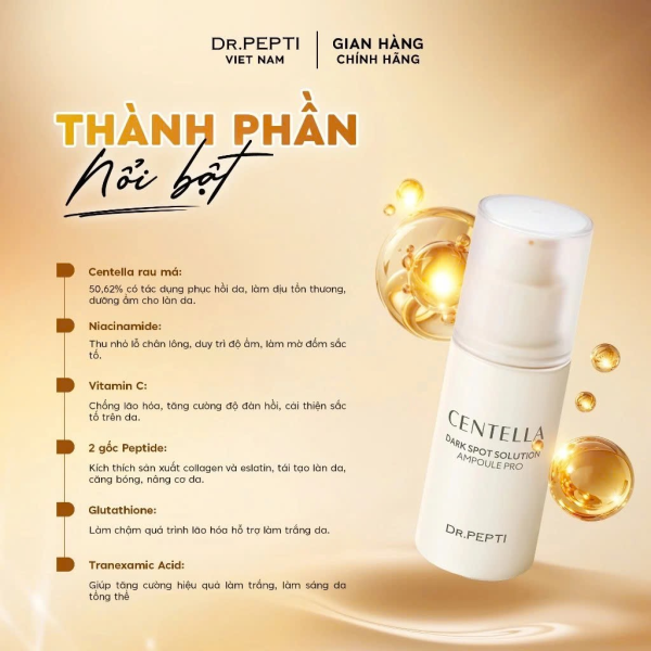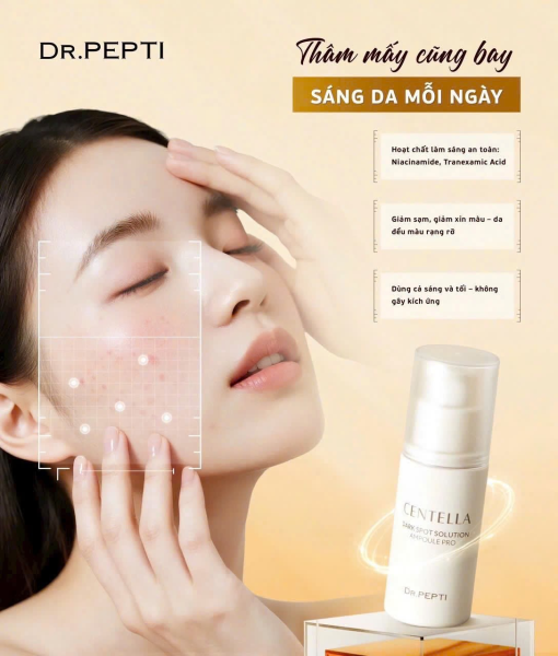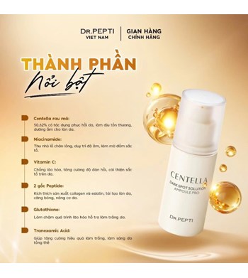 Dr.Pepti Centella Dark Spot Solution Ampoule Pro 30ml là tinh chất dưỡng da cao cấp kết hợp Centella – Peptide – Niacinamide – Glutathione, giúp cải thiện toàn diện các vấn đề về sắc tố, mang lại làn da sáng mịn, đều màu và trẻ trung hơn mỗi ngày.