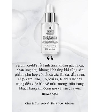 Serum Vitamin C Kiehl's Clearly Corrective Dark Spot Solution làm sáng da an toàn và hiệu quả của Kiehl's giúp làm mờ rõ rệt các vết sạm nám, cải thiện cấu trúc da, tăng sắc tố và thâm mụn. Sản phẩm không chứa paraben.