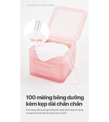 - Miếng Pad Cấp Ẩm Mediheal Collagen Ampoule Pad 100 miếng chứa Ceramide cấp ẩm và làm dịu da, giảm những tình trạng mẩn đỏ, căng rát của da, mang lại làn da căng bóng, đầy sức sống
