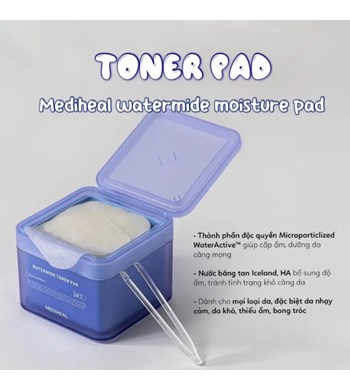 - Toner Pad Làm Sạch và Dưỡng Da Mediheal Watermide Moisture Pad (100 Pads) kết hợp cùng Lipohydroxy Acid hoạt động trên bề mặt da và có kích thước phân tử lớn hơn AHA nên ít gây kích ứng hơn.