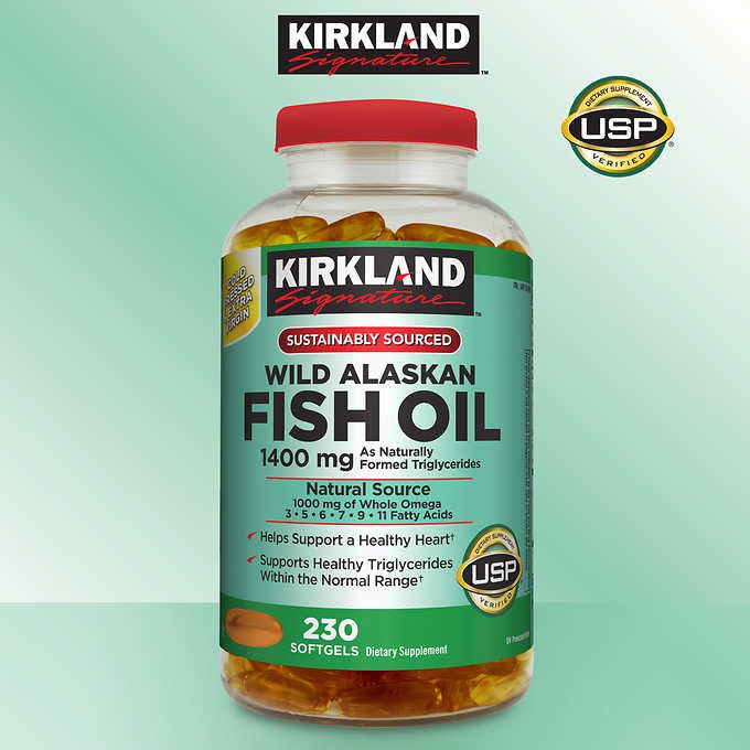 Dầu cá Kirkland Signature Wild Alaskan Fish Oil 1400mg 230 viên là sản phẩm dầu cá cao cấp được trích xuất từ những loài cá hoang của vùng biển Alaska, mang theo những axit béo có lợi cho sức khỏe con người. Dầu cá Wild Alaskan Fish Oil Kirkland bổ sung 8 loại axit béo và tất cả các Omega cần thiết cho cơ thể, thêm vào đó là vitamin A, D và Triglyceride.