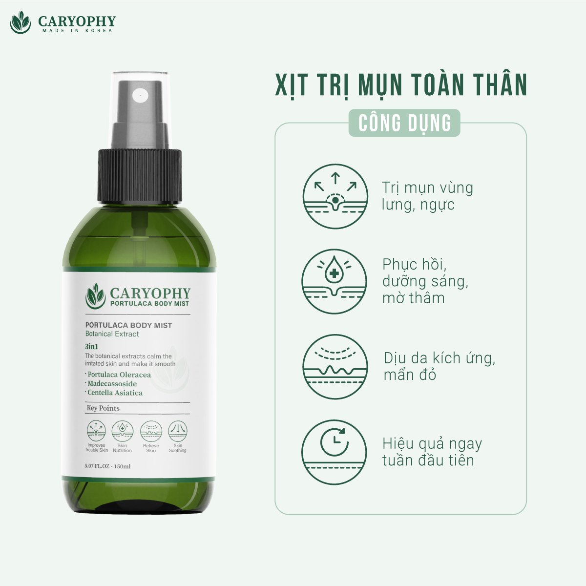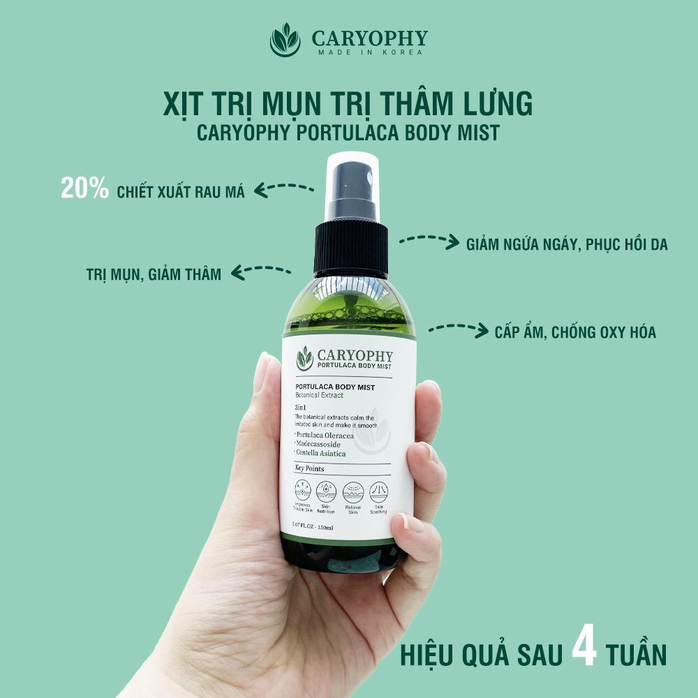 - Xịt giảm mụn Caryophy Portulaca Body Mist chứa các thành phần tự nhiên chiết xuất từ Portulaca, Centella Asiatica và nho. Sau khi nghiên cứu và thử nghiệm, nó có thể đáp ứng nhu cầu của mọi loại da, kể cả da nhạy cảm.