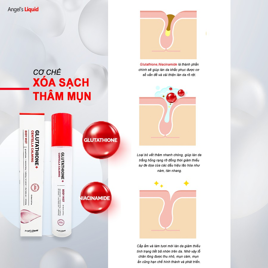 Xịt Giảm Mụn Lưng Giảm Thâm Sau Mụn Angel's Liquid Glutathione+ Centella Calming Body Mist với hiệu quả được kiểm chứng lên đến 93% mụn trên lưng và ngực ( Do hiệp hội da liễu Hàn Quốc chứng nhận) và sử dụng công nghệ Nano Glutatione kết hợp Centella giúp tạo hiệu quả 3 trong 1: Giảm mụn, giảm thâm và dưỡng trắng cho vùng da trên cơ thể .